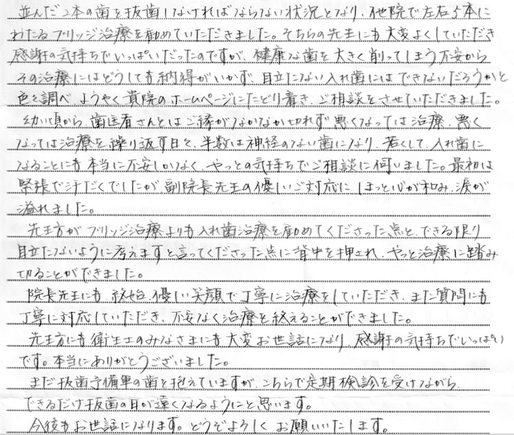 最初は緊張で汗だくでしたが、副院長先生の優しいご対応にほっと心が和み、涙が溢れました。先生方がブリッジ治療よりも入れ歯治療を勧めてくださった点と、できる限り目立たないように考えてますと言ってくださった点に背中を押され、やっと治療に踏み切ることができました。