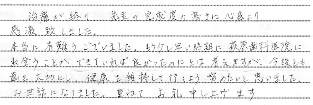 本当に有難うございました。 もう少し早い時期に、荻原歯科医院に出会うことができていれば良かったのにとは考えますが、今後とも歯を大切にし、健康を維持して行くよう努めたいと思いました。